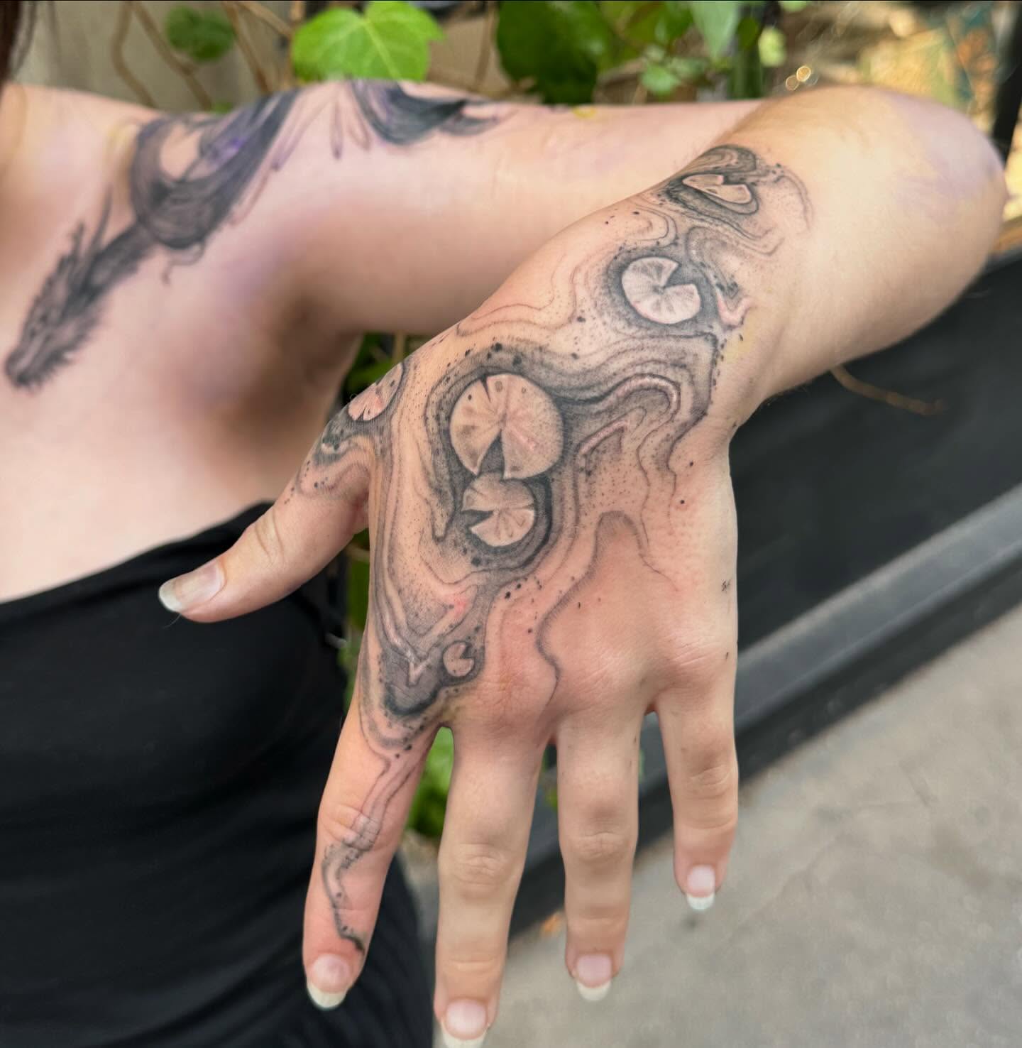 This tattoo design stands out with its swirling patterns and delicate lily pads, creating a stunning visual effect. The blend of shapes and shades gives it an artistic vibe, almost like a mini painting on the skin. For those looking for unique tattoos ideas, consider using elements from nature to inspire a truly personal piece.