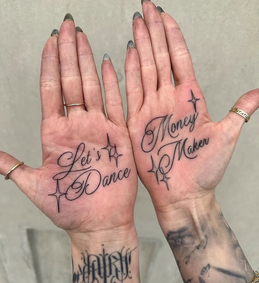 These tattoos feature playful phrases, “Let’s Dance” and “Money Maker,” elegantly inked on each palm. This creative choice not only showcases personal beliefs but also adds a fun twist to everyday life. For those considering unique tattoos ideas, hand tattoos can be a bold way to express personality and spark conversations.