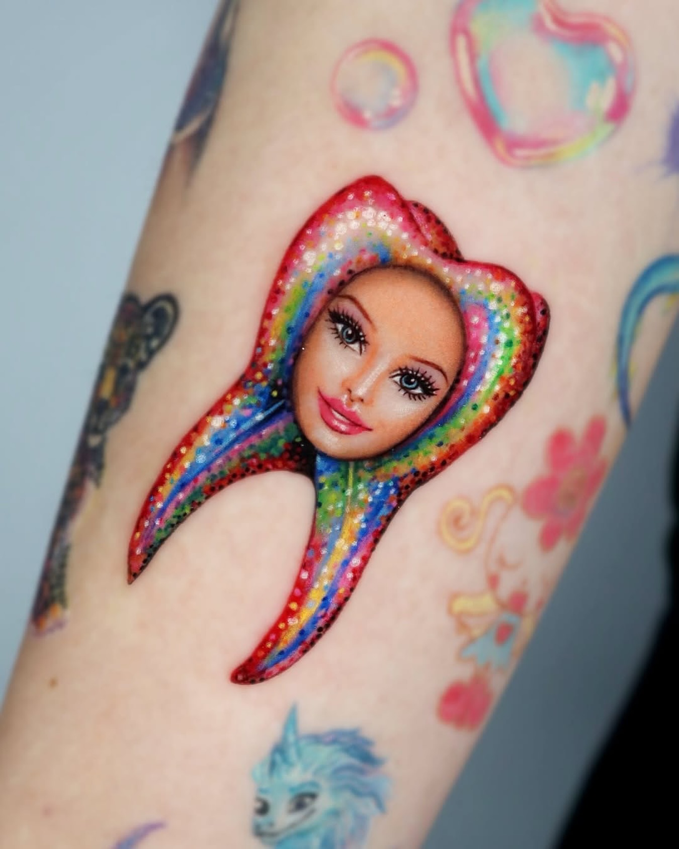 This tattoo stands out with its vibrant colors and playful design, featuring a face framed by a rainbow-like shape. It combines elements of whimsy and artistry, making it a delightful choice for anyone looking to express their unique style. For those exploring unique tattoos ideas, consider designs that reflect personal stories or favorite themes to make the artwork even more special.