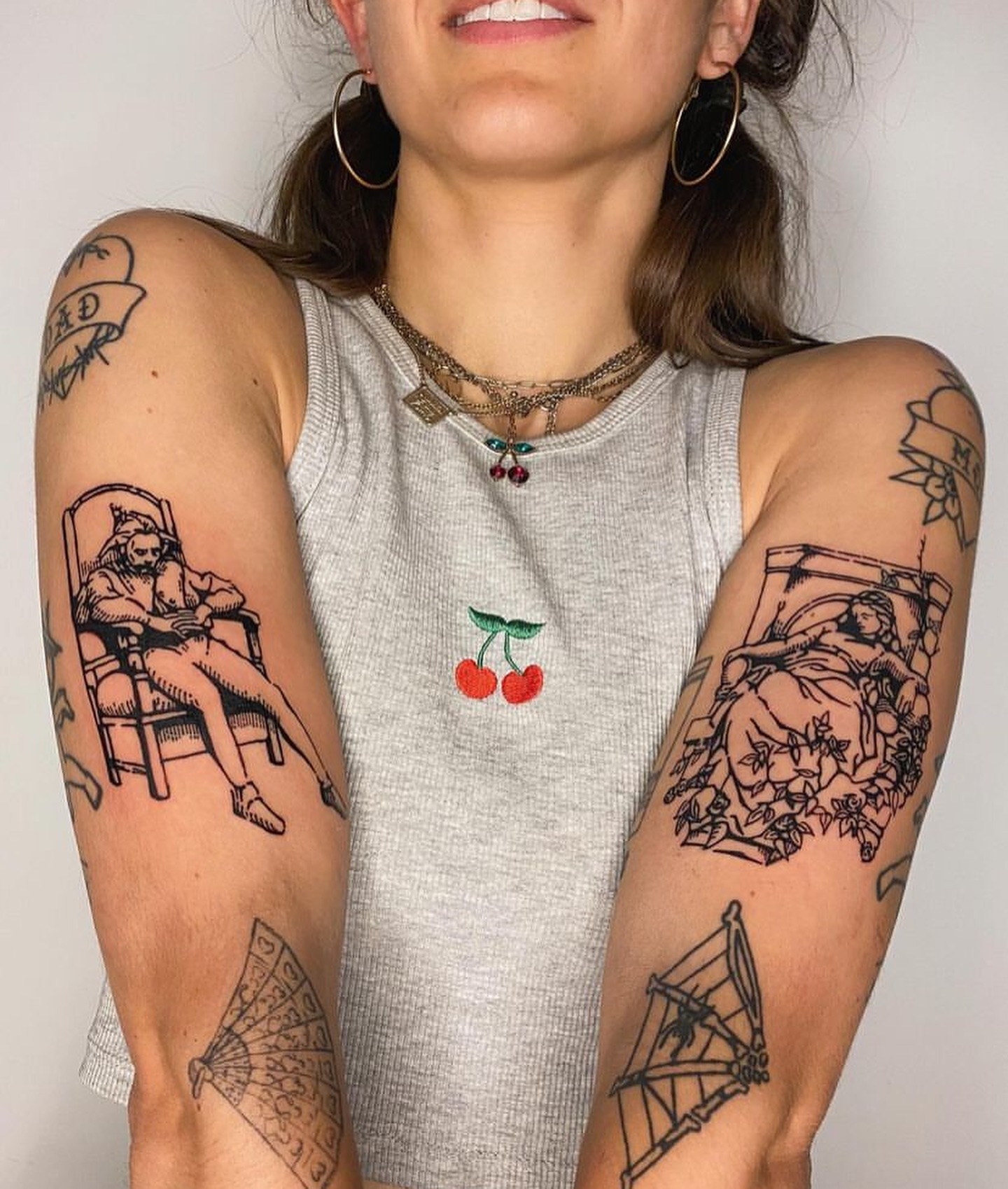 These charming tattoos tell a story through their unique designs, featuring scenes that draw the viewer in. With one arm showcasing a relaxed figure in a chair and the other depicting a serene character in bed, they create a delightful contrast. For those seeking inspiration, consider how a narrative can add meaning and flair to personal tattoo choices.