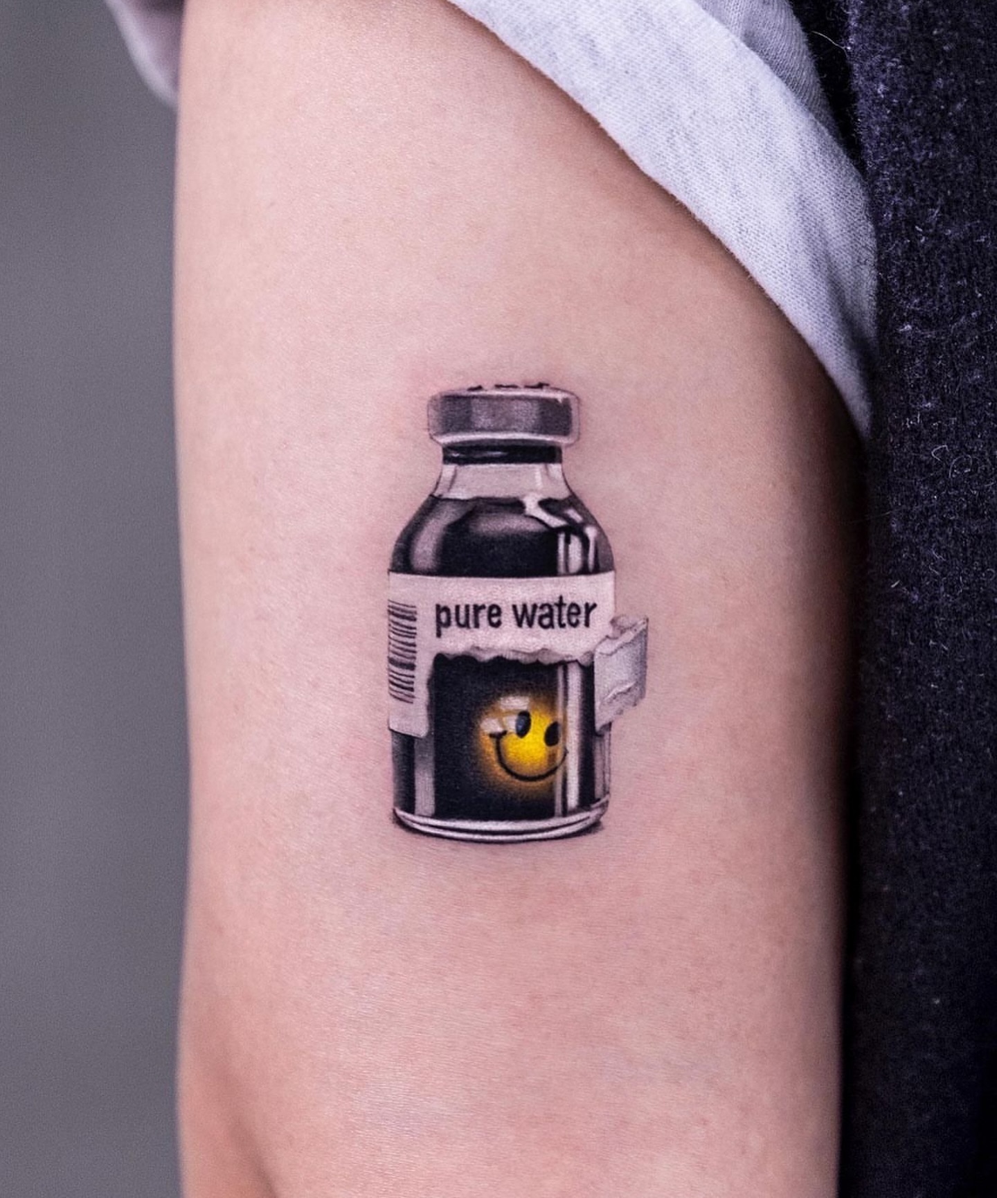 This tattoo stands out with its clever design of a bottle labeled “pure water,” hiding a cheerful smiley face inside. The playful concept adds a touch of whimsy, reminding everyone that joy can be found in the simplest things. For those looking for unique tattoos ideas, a design like this can spark joy and creativity wherever you go.