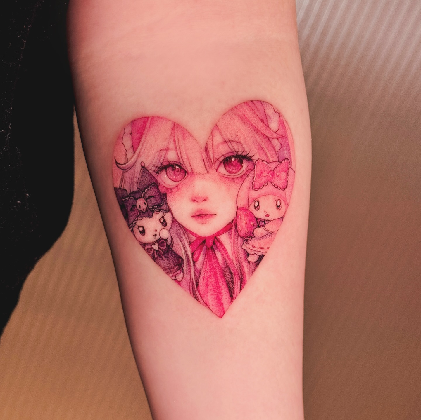 This tattoo stands out with its heart shape, featuring a whimsical blend of characters that tell a sweet story. The delicate colors and detailed art bring a playful charm to the design, making it truly eye-catching. For those seeking unique tattoos ideas, choosing a specific shape can add a personal touch that reflects individuality.