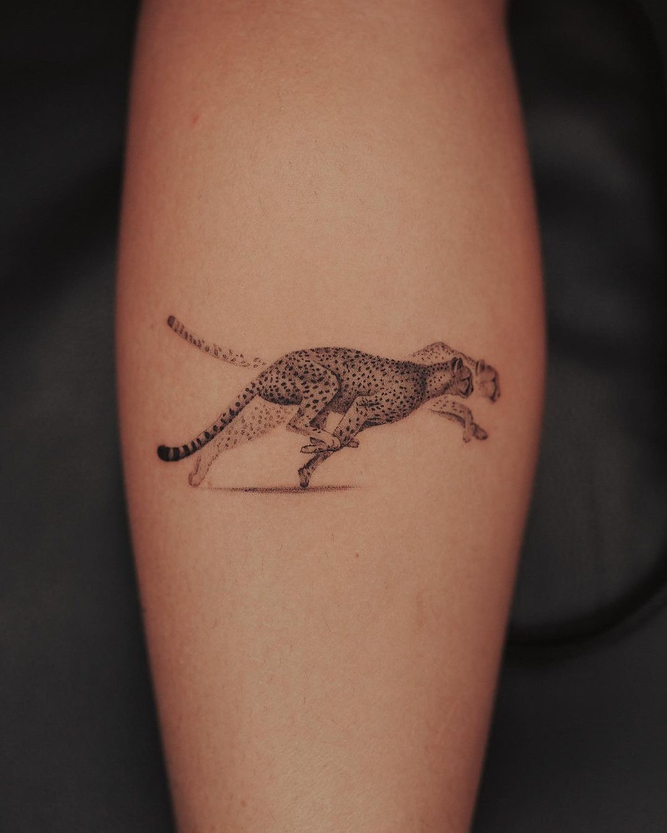 This tattoo beautifully captures the elegance of a cheetah sprinting, showcasing incredible detail and a sense of speed. The artist s skilled use of shading brings the animal to life, making it feel like it s about to leap off the skin. For those looking to express their love for wildlife, a design like this can serve as a striking reminder of nature’s beauty and power.