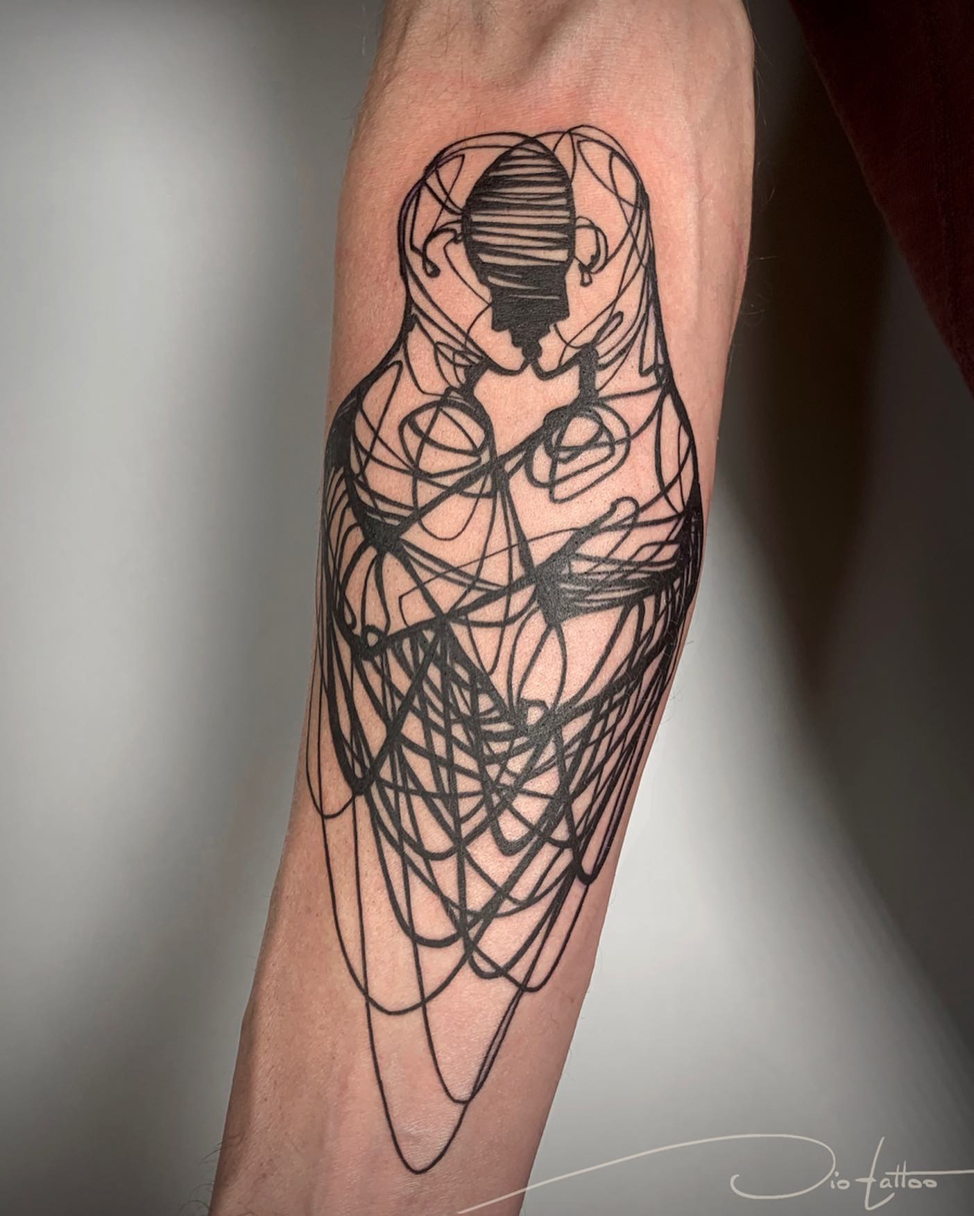 This tattoo stands out with its intricate, swirling lines that create a unique visual story. The design captures a blend of abstract forms and shapes, showcasing an innovative approach to body art. For those seeking distinctive tattoos, exploring abstract designs can lead to truly personal and meaningful creations.