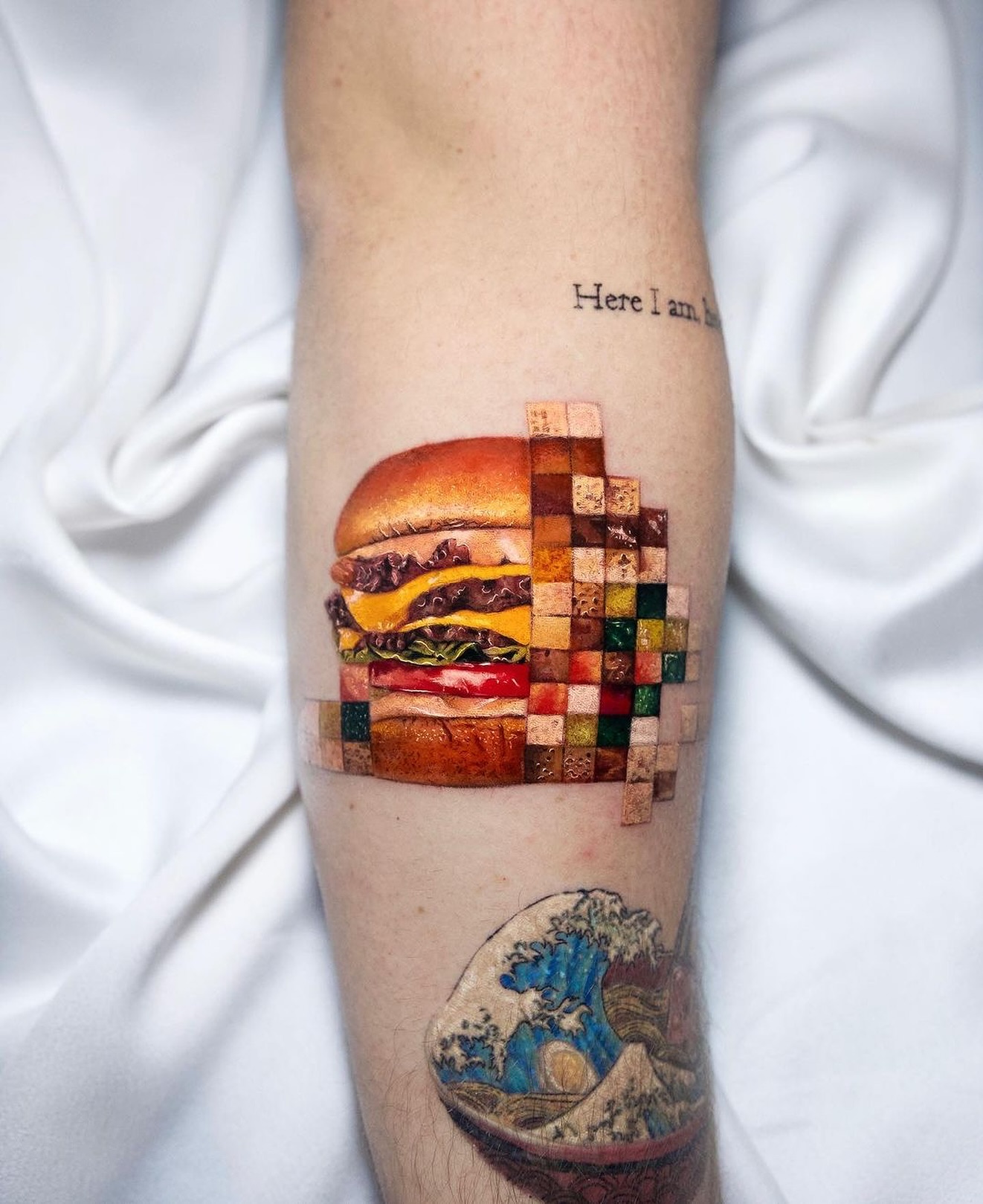 This tattoo showcases a vibrant burger design that seems to pop off the skin. The colorful details and unique three-dimensional look create a playful vibe, making it a conversation starter. For those looking for unique tattoos ideas, consider incorporating personal favorites or meaningful symbols into your design for added flair.