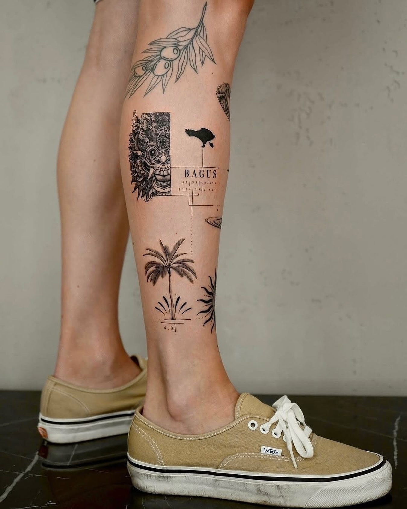 This tattoo design stands out with its mix of detailed images and symbols, creating a vibrant story on the skin. Featuring a unique blend of nature and culture, the art showcases everything from palm trees to intricate masks, making it a true conversation starter. For those considering a tattoo, think about how combining different elements can reflect personal experiences and interests in a beautiful way.