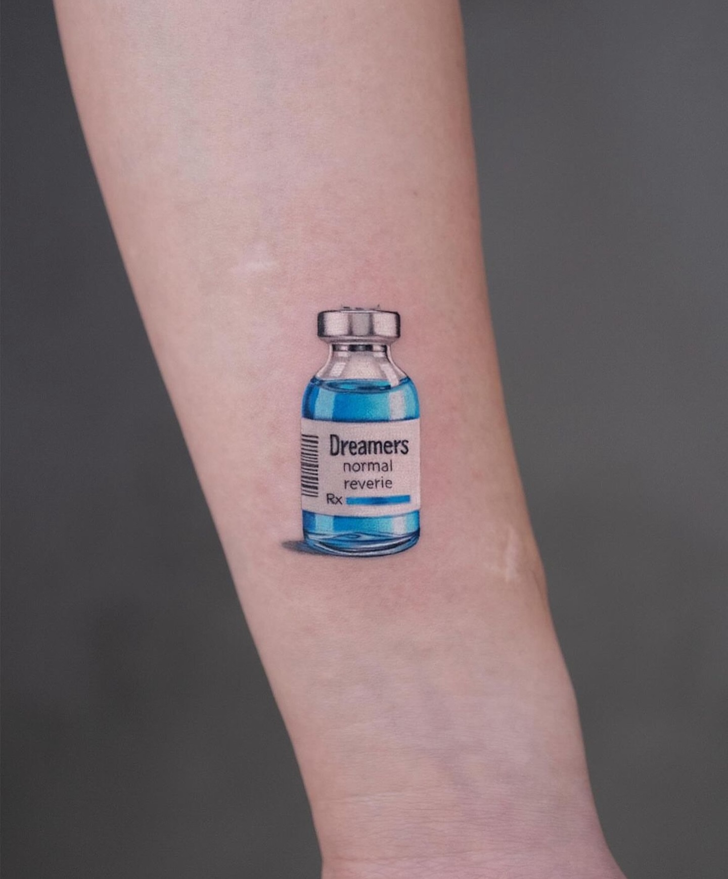 This tattoo stands out with its stunning depiction of a potion bottle labeled “Dreamers” in vibrant blue. It captures the imagination, evoking thoughts of creativity and inspiration. For those seeking unique tattoos ideas, consider how symbols of your dreams can be transformed into personal art that tells your story.
