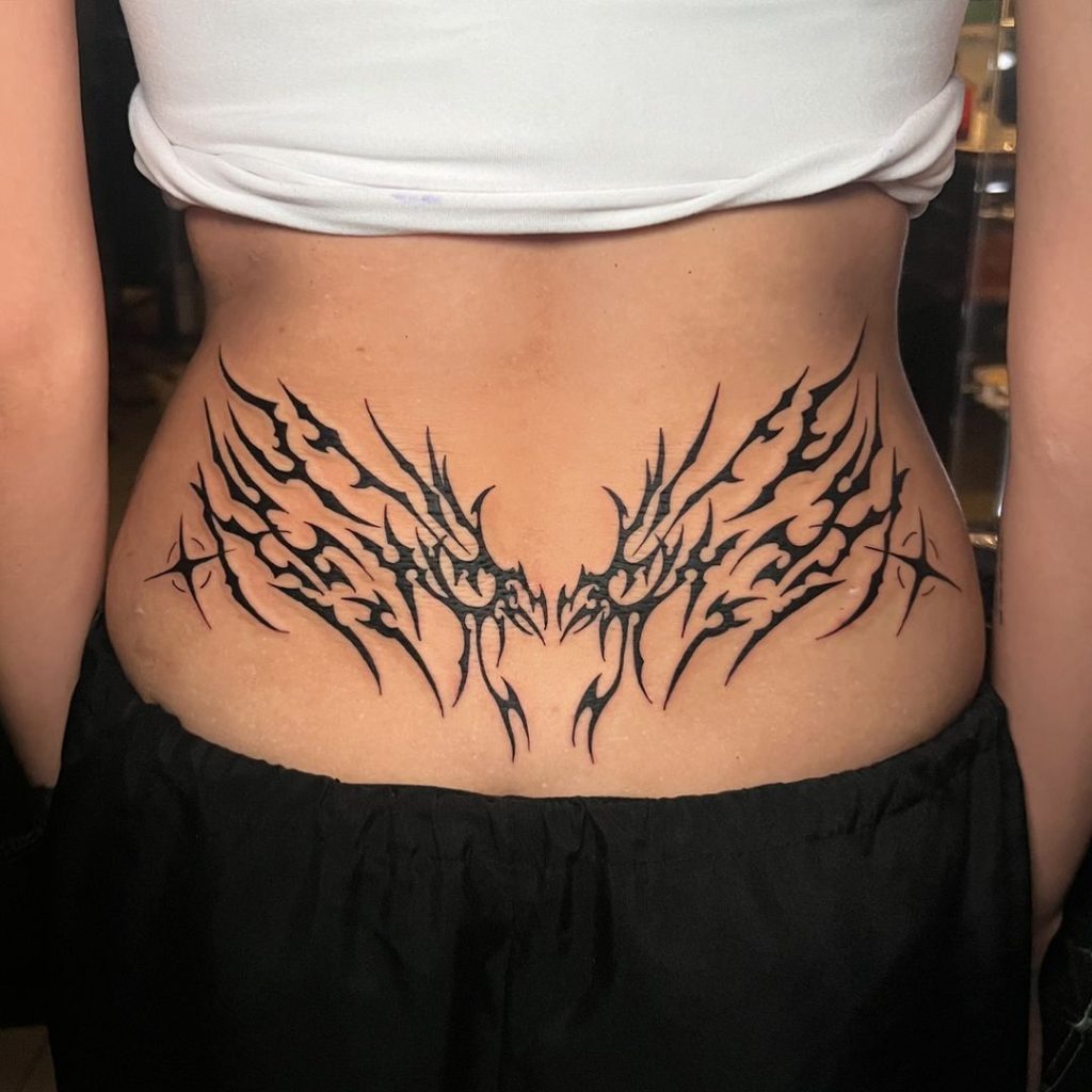 This bold design showcases a pair of sharp, tribal-inspired wings spreading across the lower back. The intricate black ink patterns create a fierce and edgy look, with a symmetrical flow that enhances the area s natural curves. Perfect for making a statement with striking symmetry!