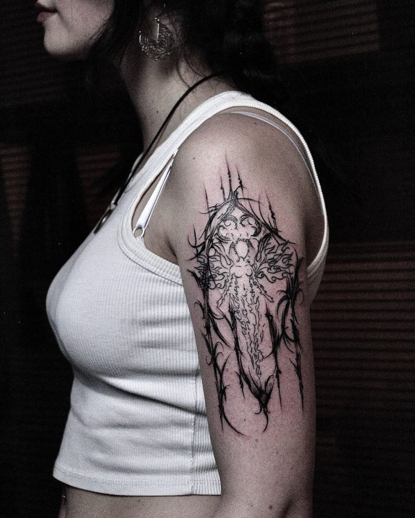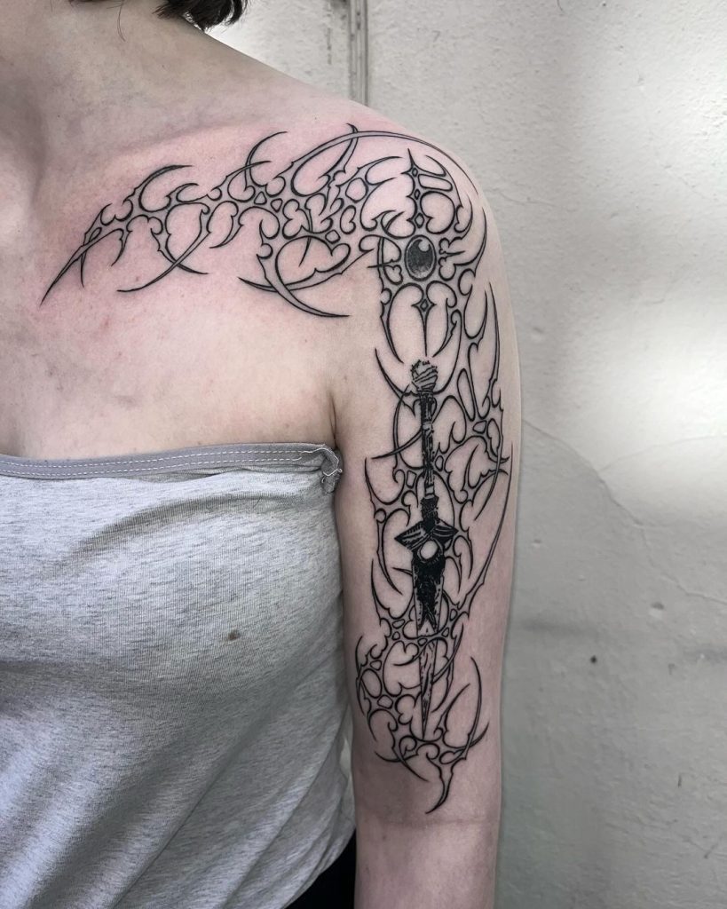 This bold tattoo features an intricate sword design vertically placed along the arm, surrounded by flowing abstract linework extending across the shoulder. The sharp, spiked details and symmetrical patterns create a striking contrast, blending strength with artistic elegance. The placement accentuates the arm’s natural curves, making it a captivating and dynamic piece.