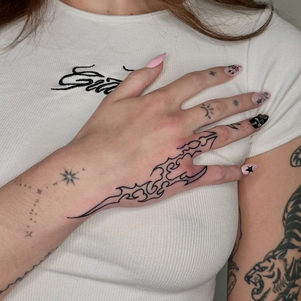This sleek hand tattoo features a wavy, flame-like design that wraps gracefully from the wrist to the finger. The sharp edges and fluid curves create a dynamic, futuristic look, complementing the natural movement of the hand. It s a bold yet delicate statement piece that draws attention to every gesture.