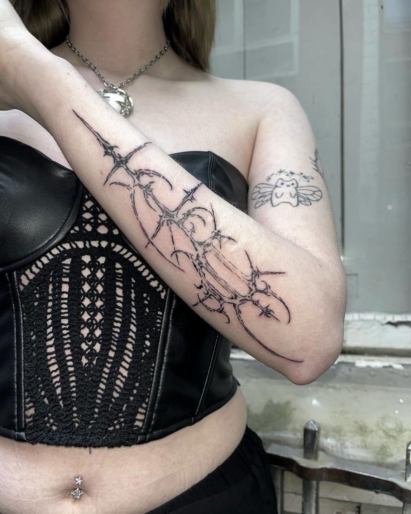 This edgy tattoo features jagged, barbed-like patterns that flow along the forearm in a striking, abstract arrangement. The sharp, angular details give it a raw, industrial vibe, balanced by its clean placement on the arm. It’s a bold statement piece, perfect for anyone with a love for sharp, modern aesthetics.
