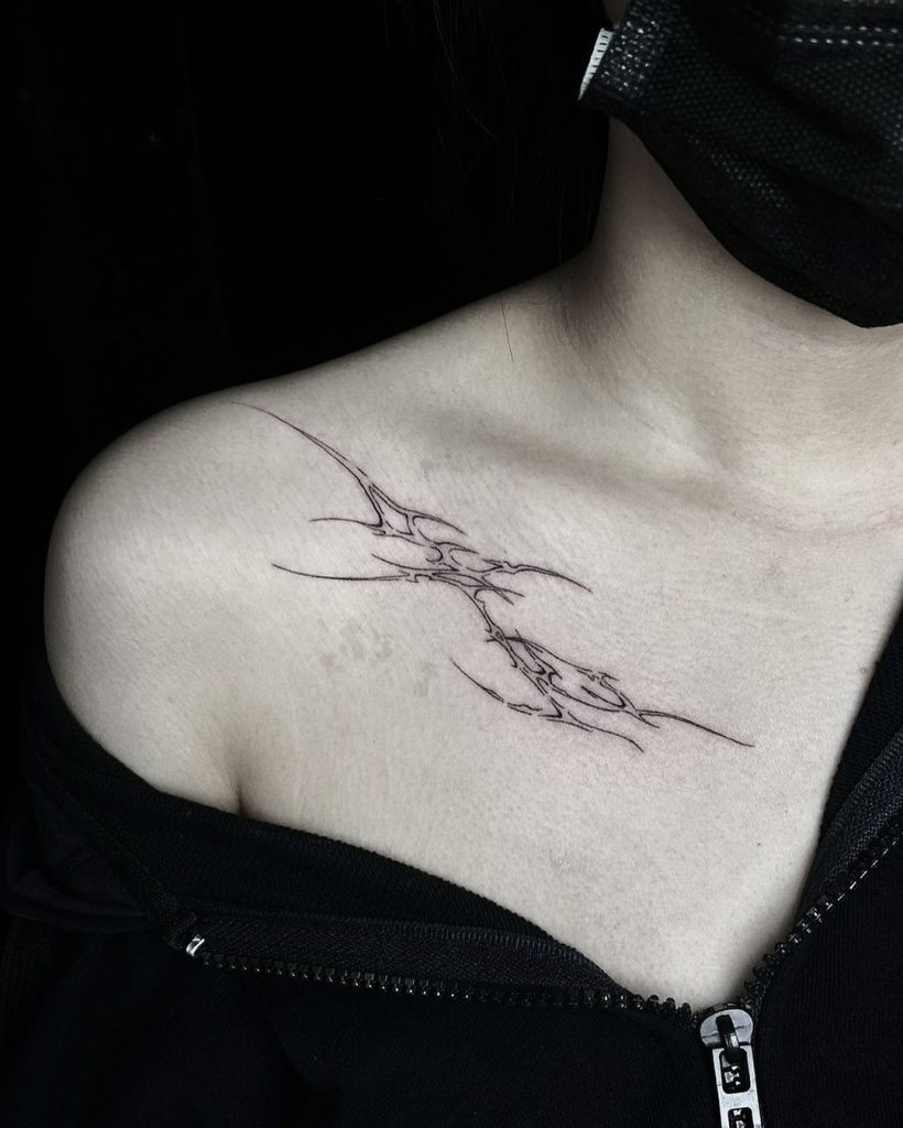 This delicate collarbone tattoo features sharp, flowing lines in an abstract style, creating a minimalist yet striking design. The fine linework stretches elegantly along the collarbone, blending subtlety with edge. Its placement enhances the natural contour of the collarbone, making it a perfect understated piece.