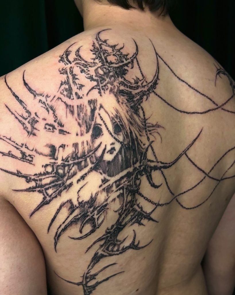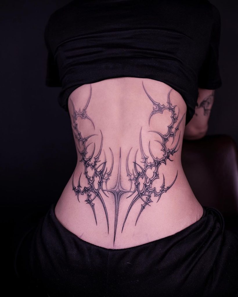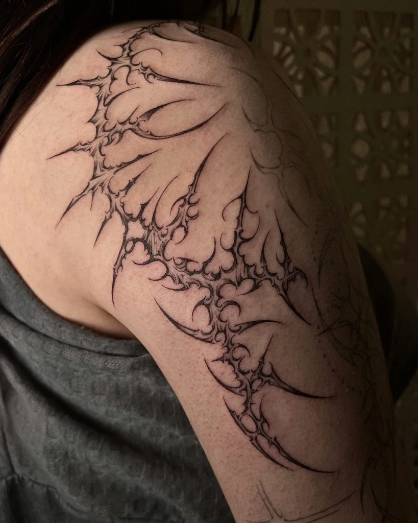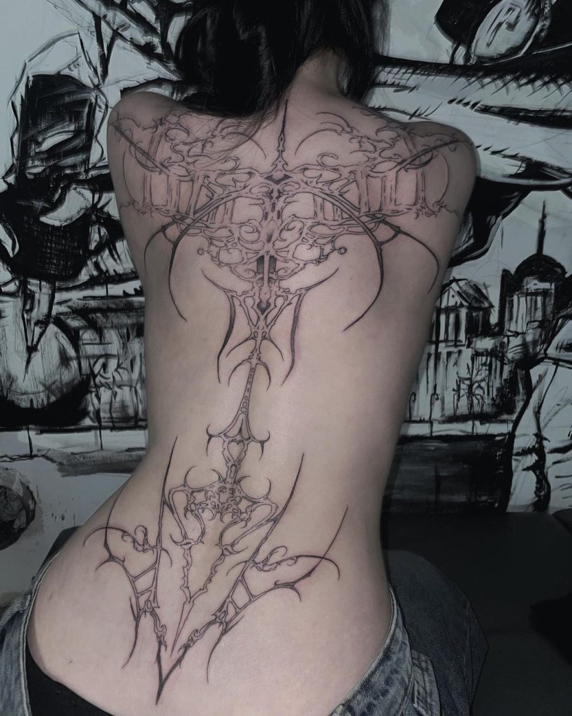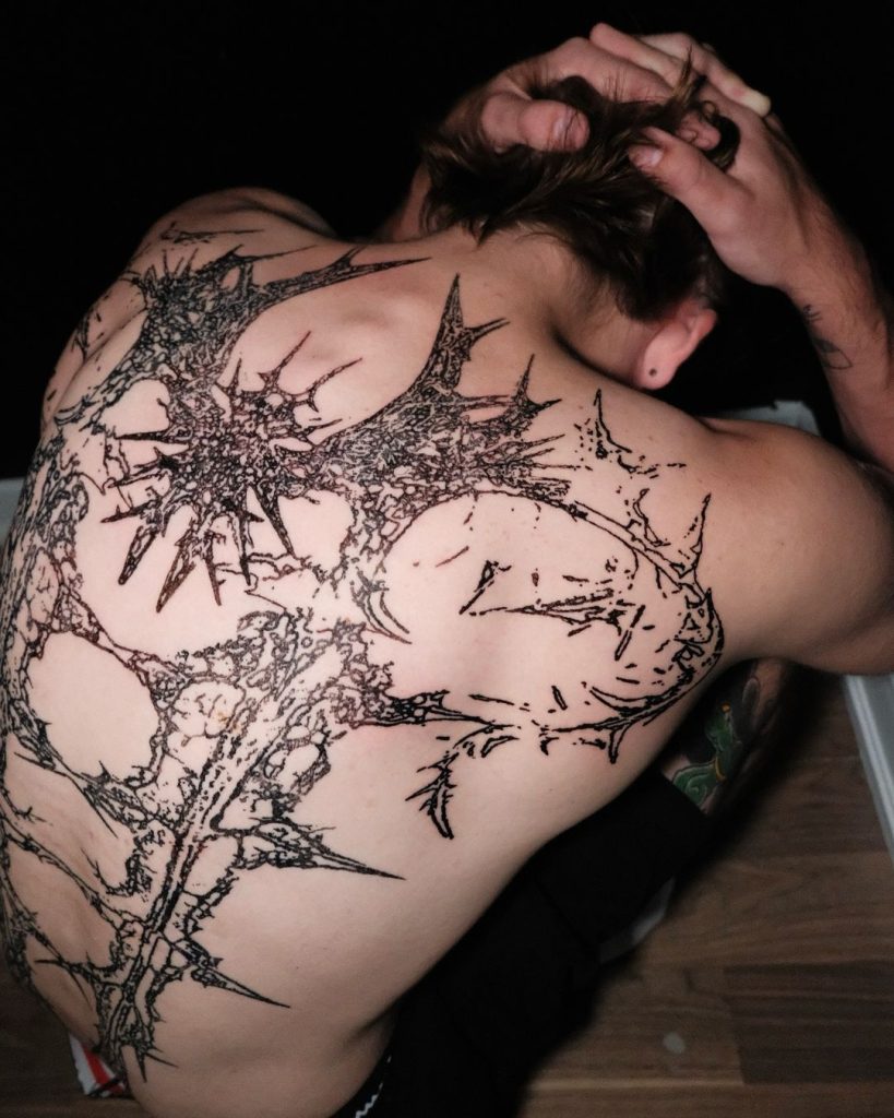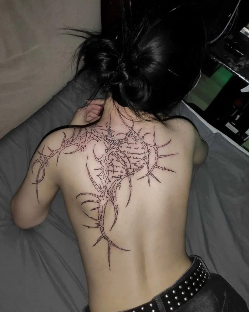This intricate tattoo extends across the upper back and shoulders, with jagged, branching lines creating an otherworldly, organic design. The spiked edges and web-like structure give it a raw and futuristic feel, perfectly accentuating the natural curve of the back. It’s a bold statement piece that exudes strength and mystery.