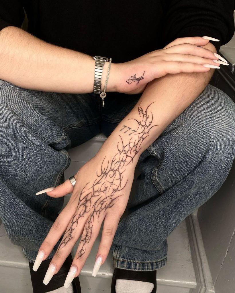 This intricate tattoo features flowing, web-like patterns extending from the forearm down to the hand, creating a seamless and elegant design. The fine, sharp lines give it a graceful yet edgy appearance, with “777” subtly incorporated for a touch of symbolism. Perfectly placed, the design accentuates the natural curves of the hand and wrist, blending style with individuality.