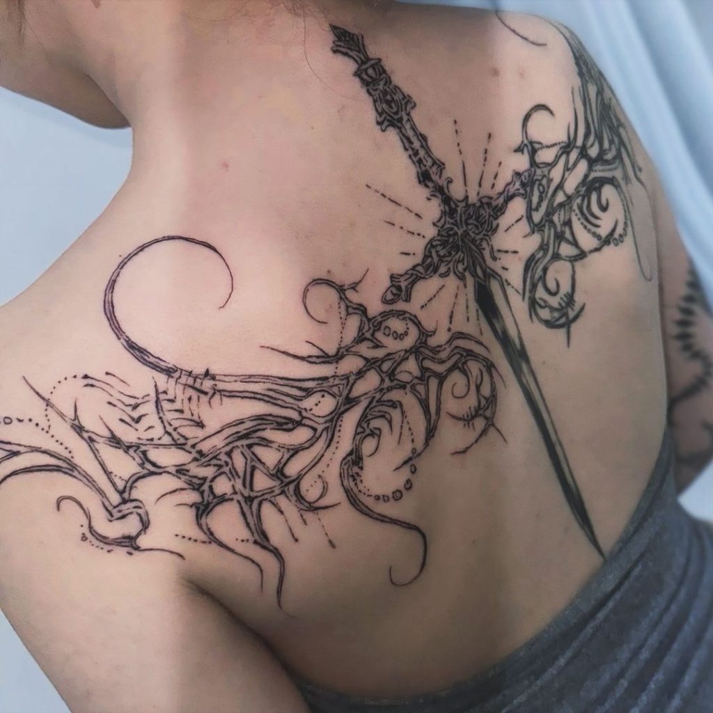 This captivating upper back tattoo combines a detailed sword with flowing cybersigilism-inspired linework. The blade extends vertically, surrounded by swirling organic shapes, dot accents, and radiating light patterns that add depth and energy. The design blends strength and mysticism, creating a striking centerpiece that feels both futuristic and artistic.