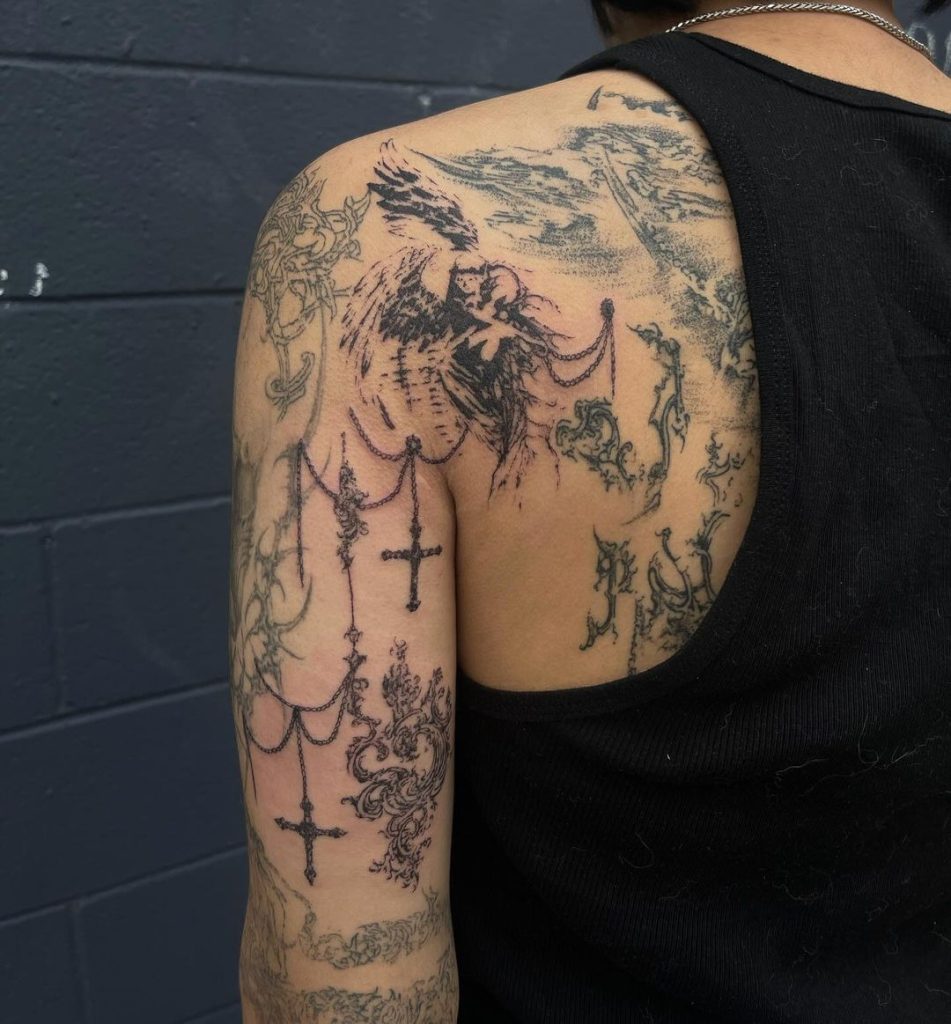 This intricate shoulder and upper arm tattoo features a delicate angel in motion, surrounded by chains adorned with crosses. The design blends soft, ethereal strokes with elegant ornamental details, giving the piece a divine and timeless feel. Its placement on the shoulder flows seamlessly with the contours of the arm, creating a heavenly masterpiece.