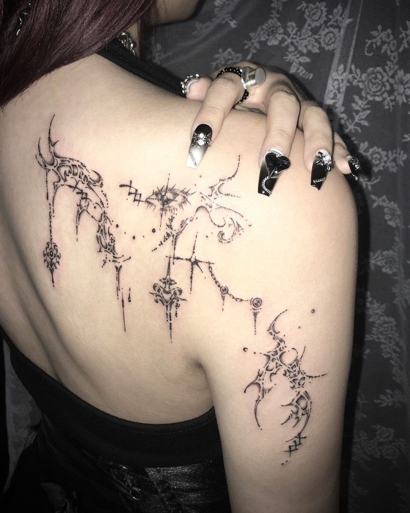 This tattoo showcases a mystical arrangement of cybersigilism symbols across the shoulder and upper arm. Fine, spiked details and delicate dotted accents create an enchanting, almost celestial appearance. Positioned perfectly along the shoulder blade, it exudes a mysterious and futuristic elegance.