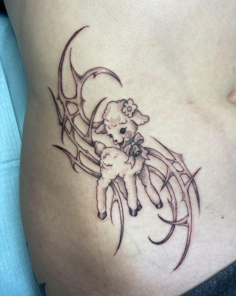 This charming tattoo features a sweet, fluffy lamb adorned with a flower and bow, surrounded by sharp, web-like abstract lines. The mix of soft, playful details with edgy accents creates a unique balance of innocence and boldness. Positioned on the side of the torso, this design is both endearing and strikingly modern.