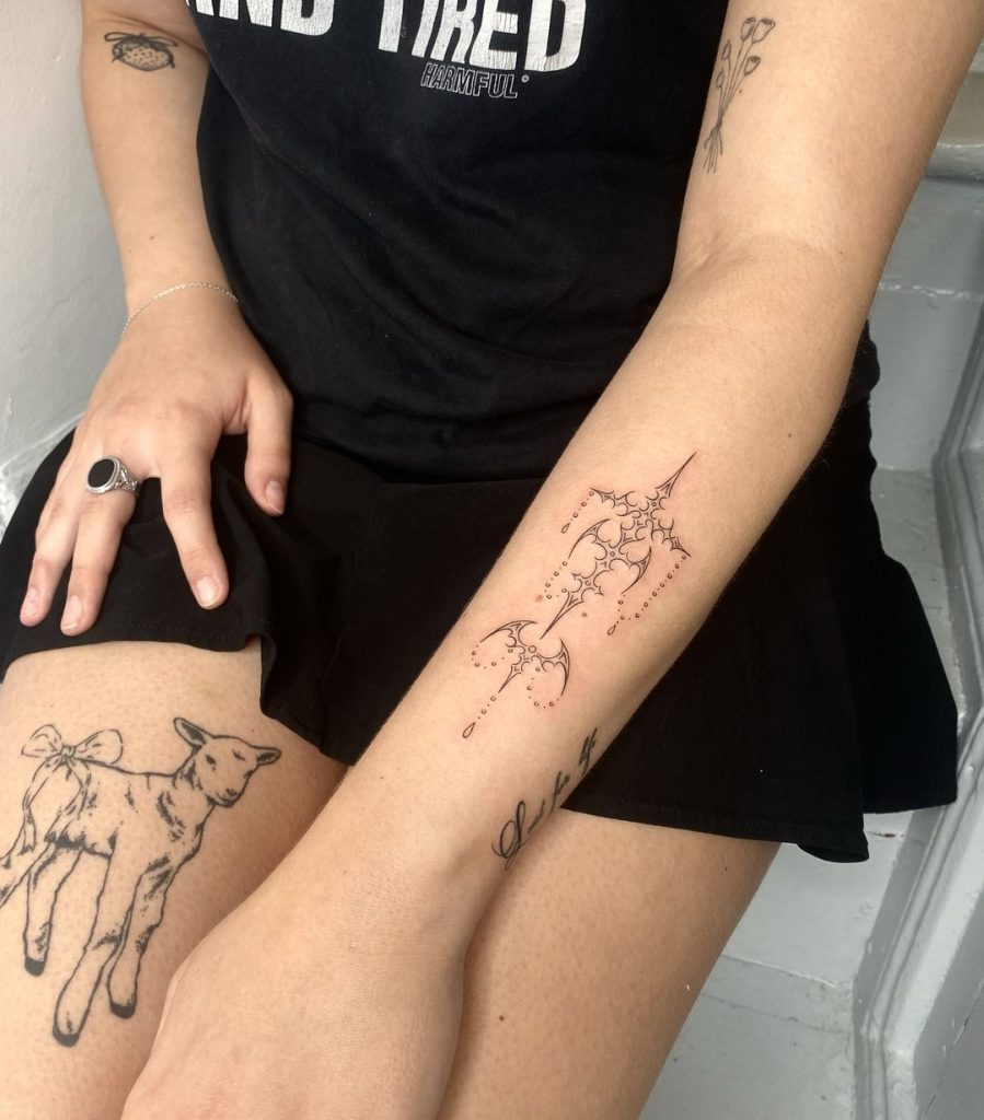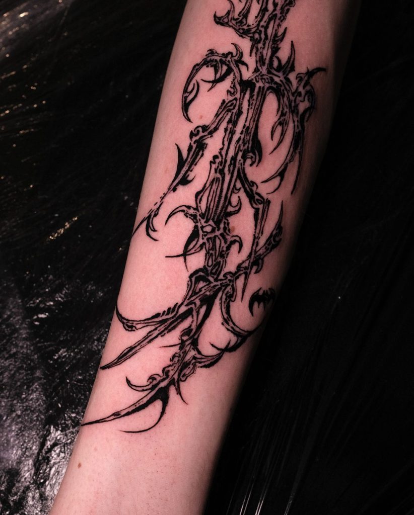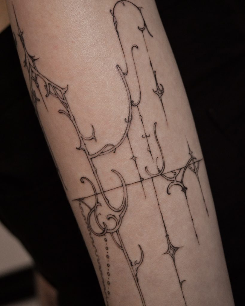 This intricate forearm tattoo features a series of thin, flowing lines and sharp hooks, resembling an abstract web of interconnected symbols. The minimalist design incorporates fine curves and star-like accents, giving it an ethereal and futuristic vibe. Its elegant placement enhances the forearm’s natural contours, creating a refined and unique look.