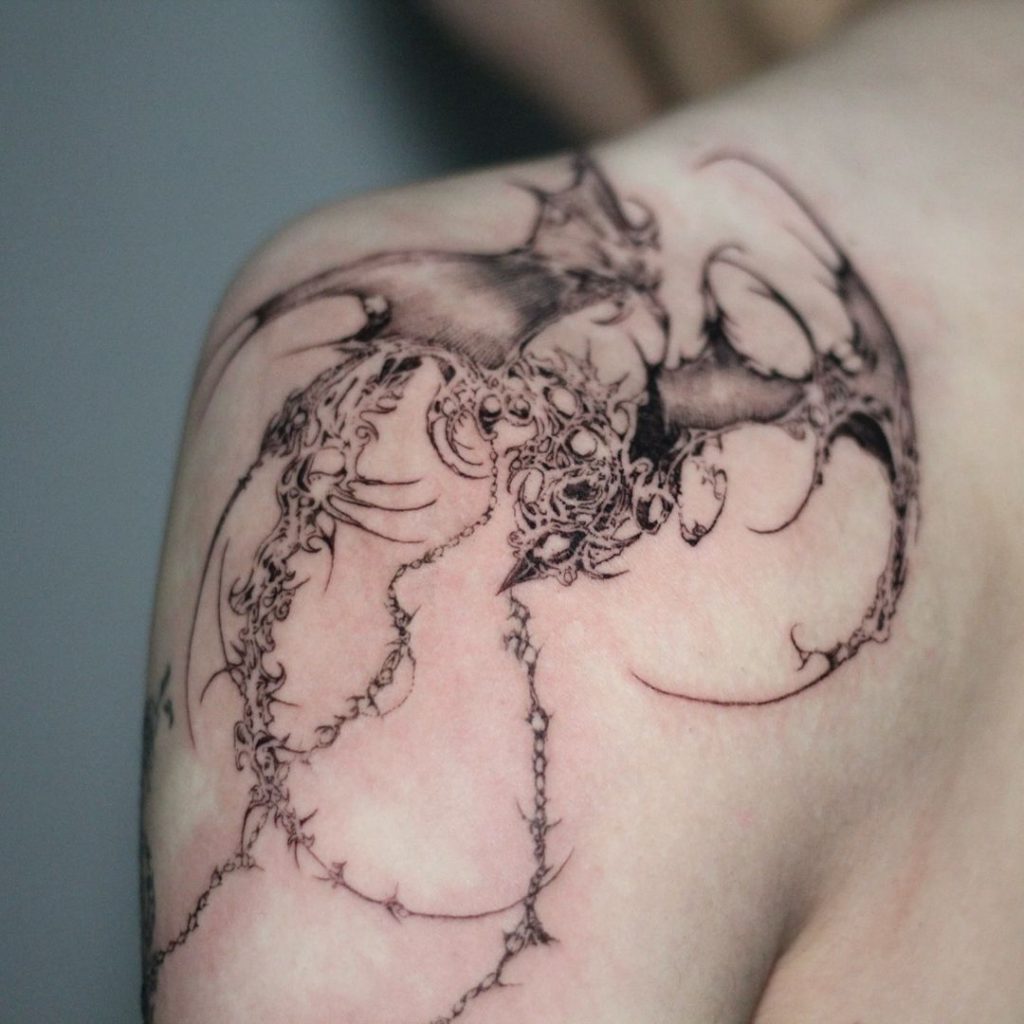 28. Intricate Cybersigilism Creature Tattoo on Shoulder