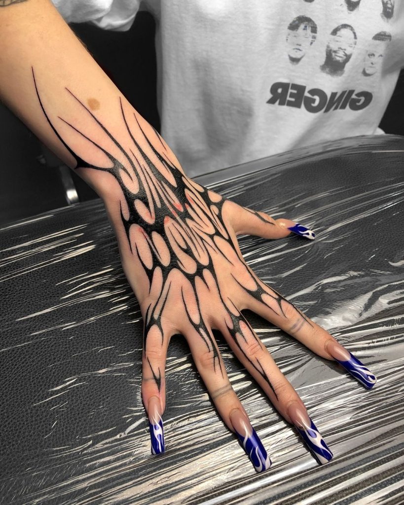 This sleek tattoo features an intricate, web-like design extending from the forearm down to the hand, with sharp, futuristic patterns reminiscent of cybersigilism. The bold black ink contrasts strikingly with the skin, creating an edgy, digital-inspired aesthetic. Its seamless flow over the hand and fingers makes it a visually captivating and modern statement piece.