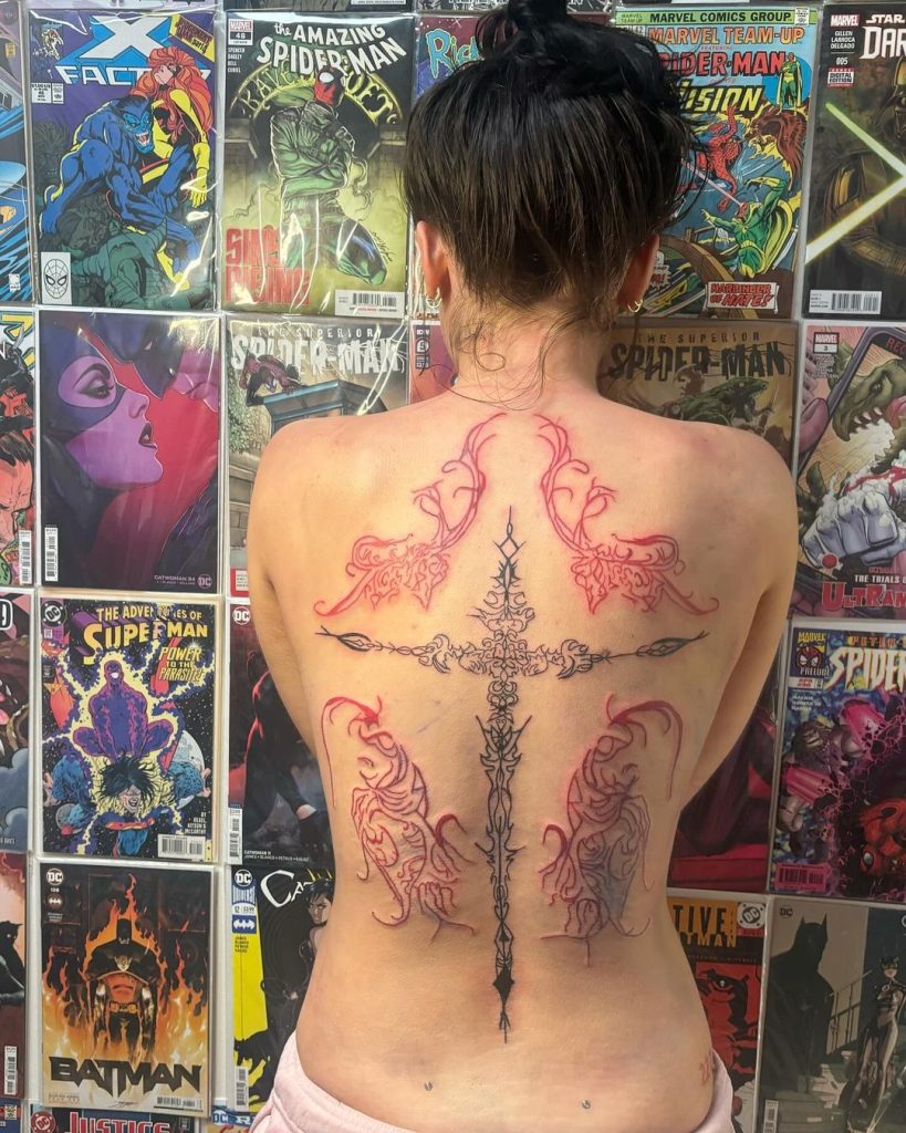 This breathtaking design showcases a delicate black cross at the center, surrounded by swirling red flame-like patterns that extend across the entire back. The fine details and balance between bold black and soft red give it an otherworldly, spiritual energy. It s a stunning statement piece that blends faith and fiery symbolism in a bold, artistic way.