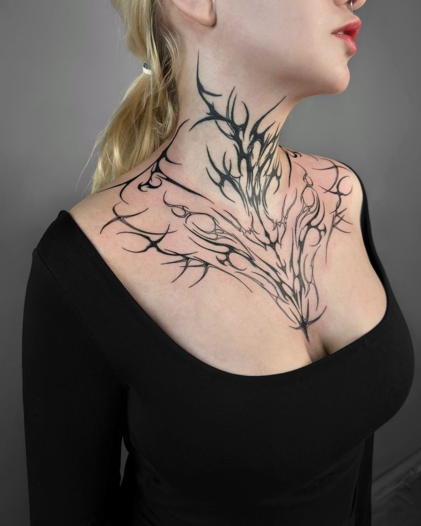 This bold tattoo flows seamlessly from the neck to the chest, featuring sharp, branching thorn-like designs that create an intricate and striking pattern. The black ink contrasts beautifully with the skin, accentuating the graceful curves and symmetry of the placement. It’s a dramatic, elegant design that commands attention and exudes edgy sophistication.
