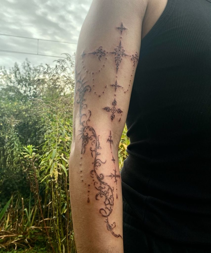 This intricate arm tattoo features delicate cybersigilism-inspired designs, combining ornate crosses, fine curves, and droplet-like details. The patterns cascade down the forearm, creating a graceful yet otherworldly look. The tattoo’s placement enhances the natural contour of the arm, giving it a sophisticated and celestial vibe.