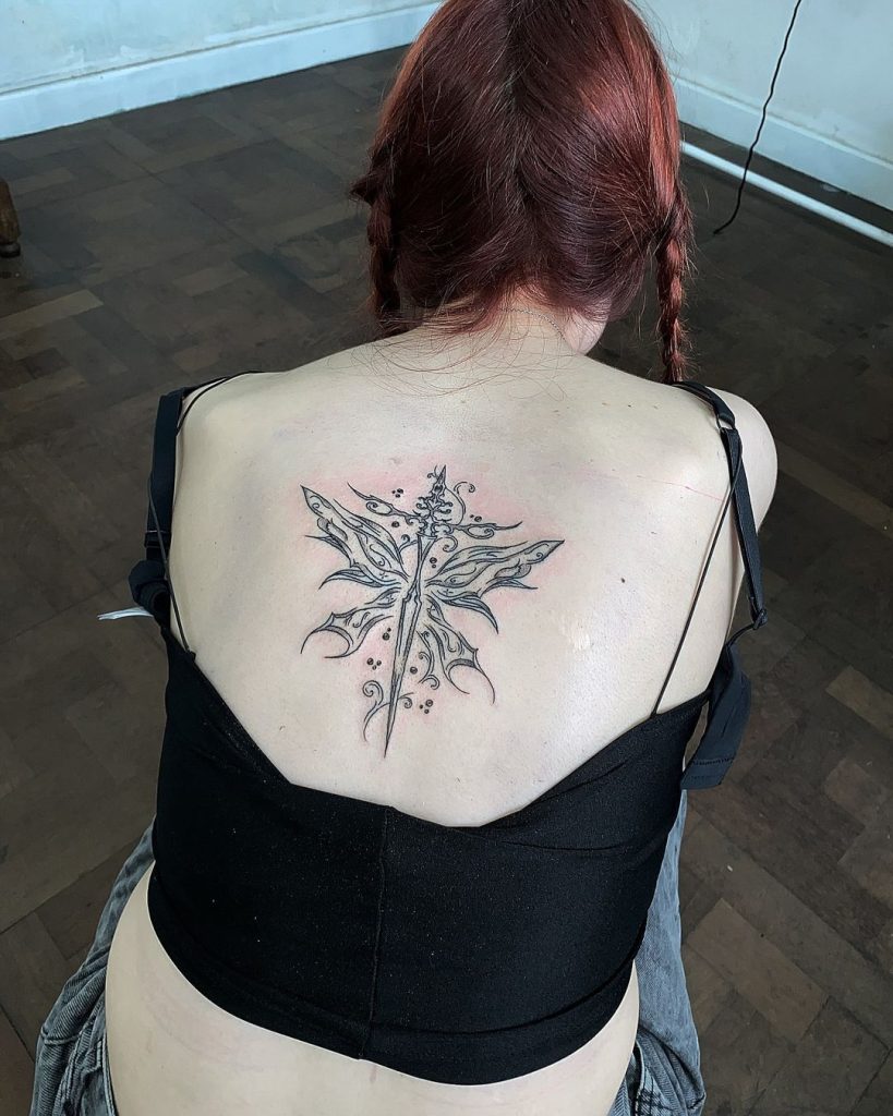 This back tattoo showcases a striking design of a sword fused with butterfly wings, combining strength and delicacy. Intricate patterns on the wings and subtle details along the sword create a graceful, otherworldly look. Positioned between the shoulder blades, it symbolizes balance and transformation in a unique and artistic way.