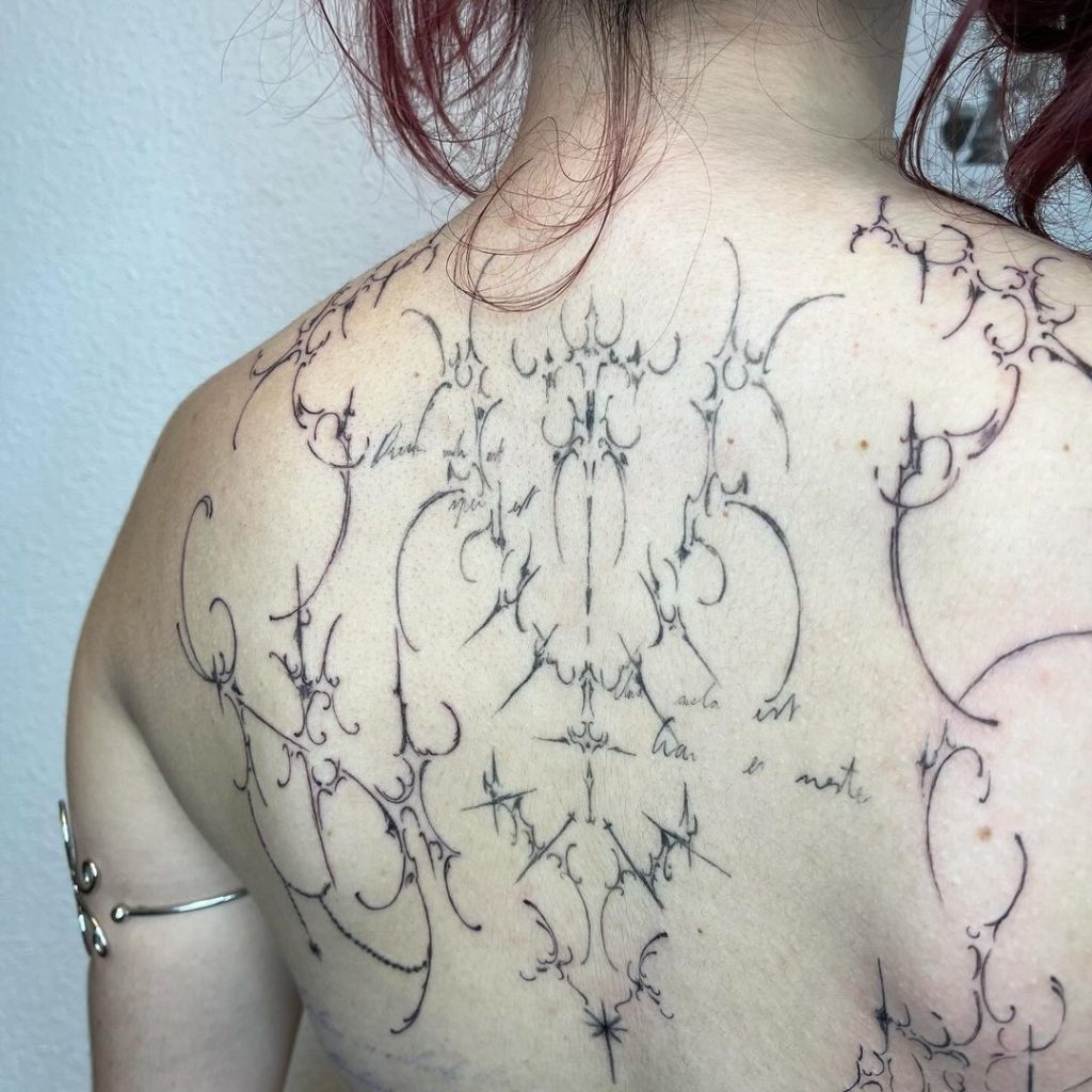 This intricate back tattoo features a sprawling, ornamental design made up of fine, graceful lines that resemble filigree or lace. The light, airy placement creates a sense of elegance, while faint handwritten text adds a personal, poetic touch. Spanning across the upper back and shoulders, it s a mesmerizing piece that feels both delicate and artistic.