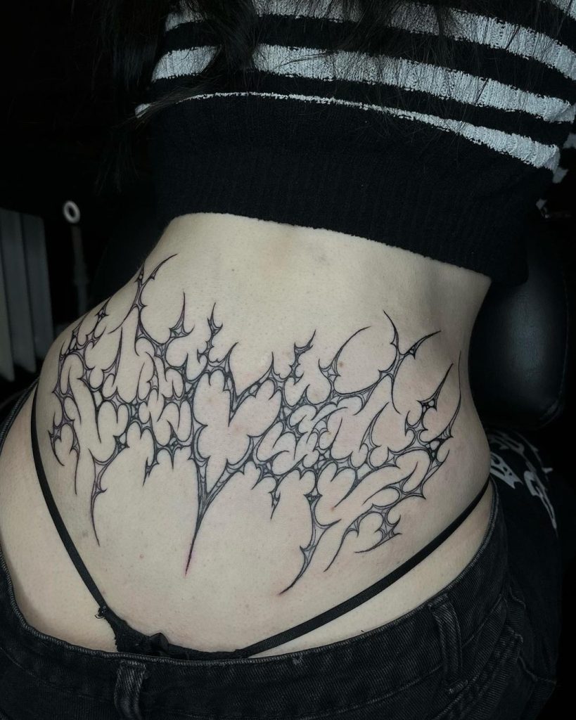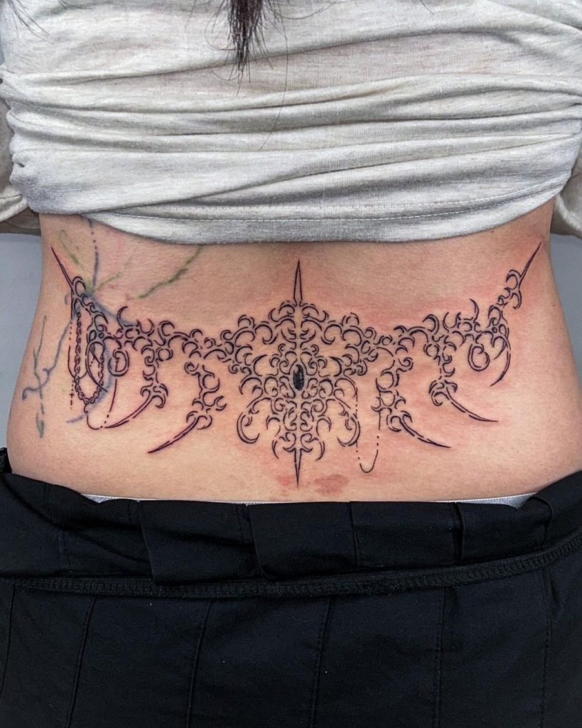This elegant lower back tattoo features a symmetrical, lace-like pattern with sharp points and intricate swirls, radiating a futuristic yet regal vibe. The fine details and bold central point create a mesmerizing focal piece, perfectly hugging the natural curve of the back. It’s a striking blend of delicate ornamentation and edgy precision.