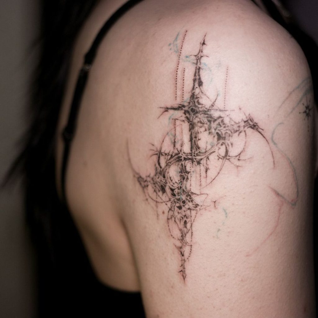 This intricate upper arm tattoo features a delicate cybersigilism design composed of sharp points, swirling patterns, and fine dotwork. The symmetrical composition creates a futuristic and ethereal aesthetic, blending organic curves with edgy elements. Its placement on the shoulder enhances the tattoo’s elegant flow and subtle complexity.