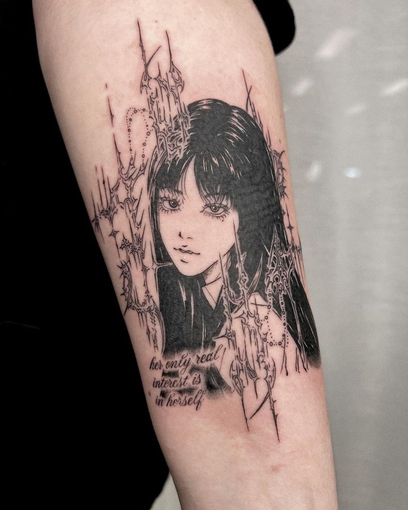 This stunning tattoo features a detailed manga-style portrait of a girl with sharp, expressive eyes and sleek black hair. Surrounding her are abstract, jagged designs and fine dotwork that add a dark, edgy atmosphere. The text below, “her only real interest is in herself,” complements the mysterious and self-assured vibe of the piece, making it a bold and artistic forearm statement.