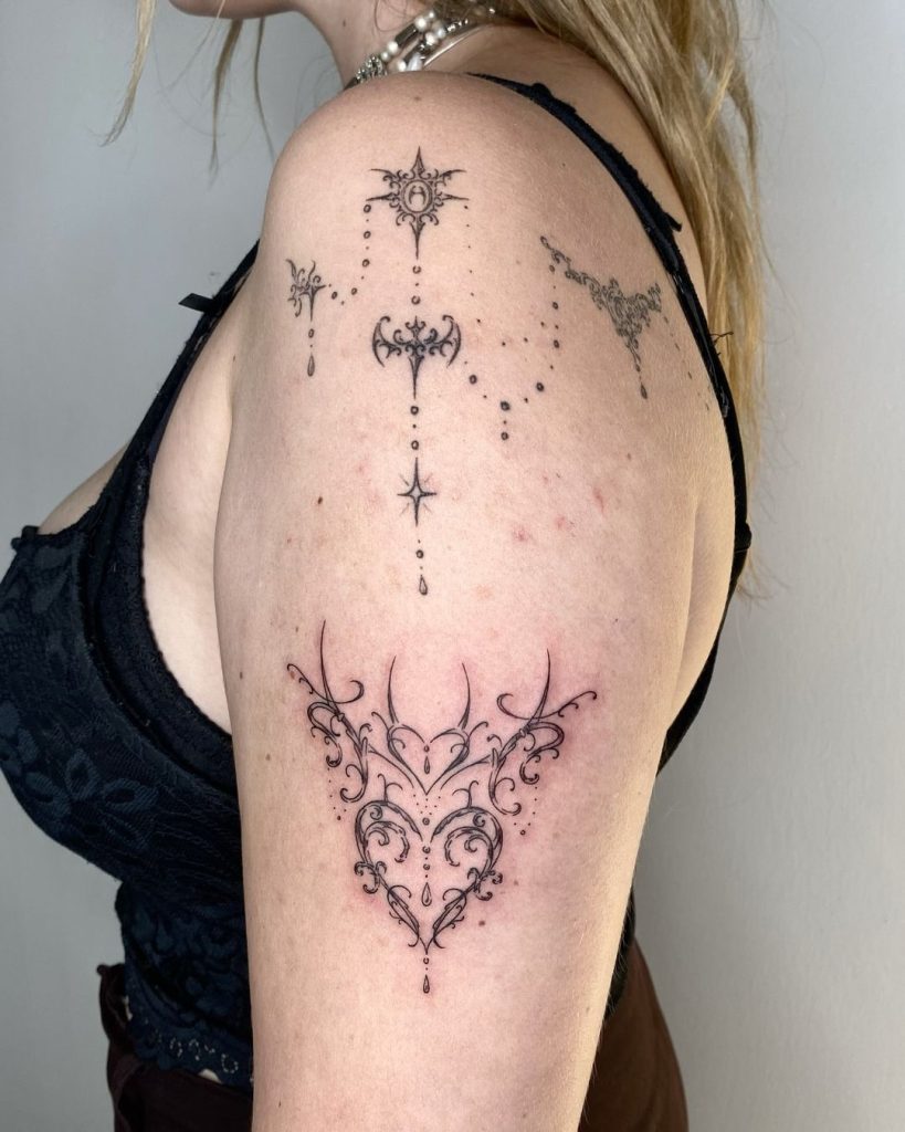 This elegant upper arm tattoo features a heart-shaped design crafted with intricate ornamental details and flowing linework. Delicate dotwork and symmetrical accents enhance its refined, decorative aesthetic. The surrounding celestial-inspired patterns add a whimsical touch, making the piece both graceful and enchanting.