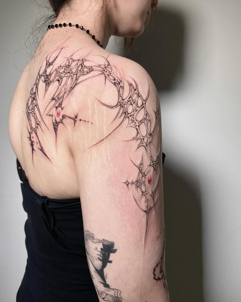 This bold tattoo wraps around the shoulder with a sharp, web-like design, featuring intricate patterns and spiked edges. Subtle red accents add a touch of intensity, drawing the eye to key points in the design. The placement on the shoulder and upper arm gives it a dynamic and striking presence, blending elegance with an edgy, futuristic vibe.