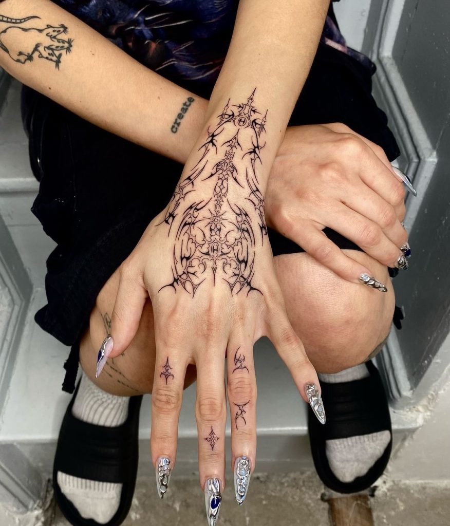 21. Ornate Cybersigilism Tattoo on Hand and Fingers