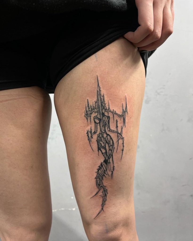This striking tattoo features a jagged, spine-like design that twists downward in a dark, futuristic style. The pointed peaks and intricate detailing give it a sharp, otherworldly vibe, perfectly positioned on the upper thigh for a bold statement.