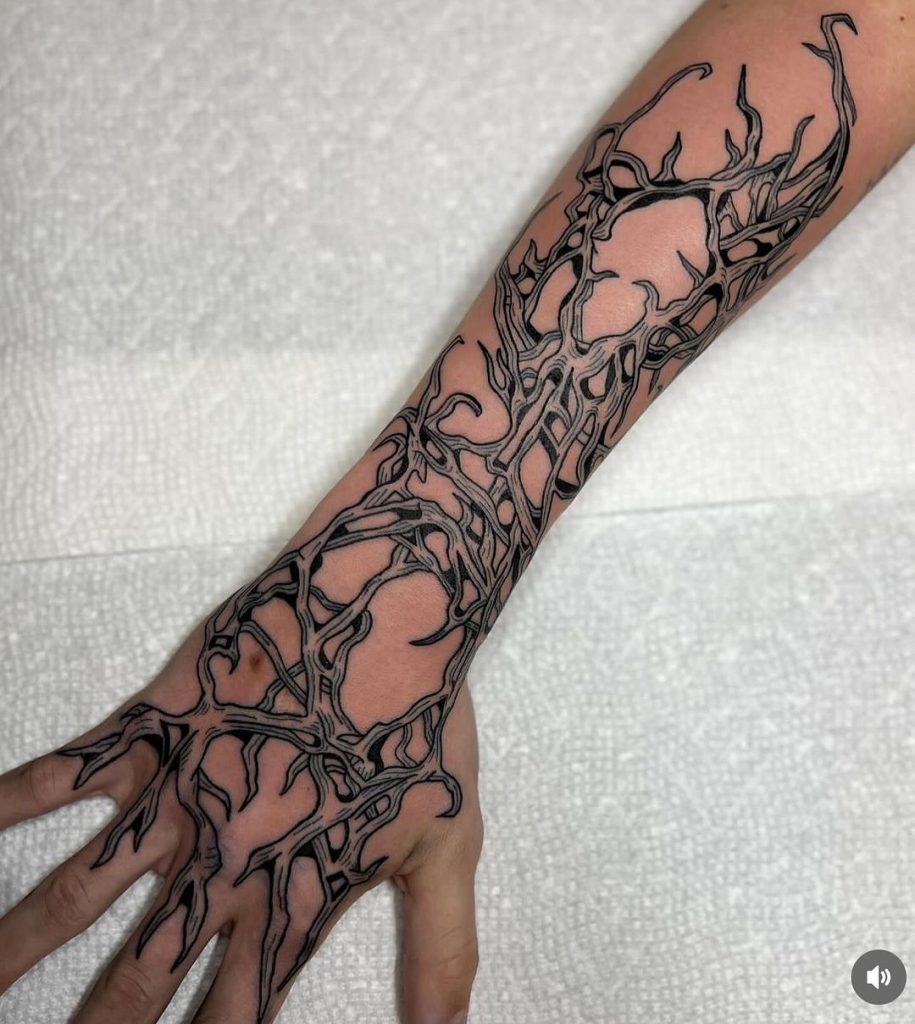This captivating tattoo covers the forearm and hand with a sprawling, web-like design of interconnected black lines. The intricate pattern has a raw, organic flow, resembling twisting roots or veins, extending seamlessly down to the fingers. Its bold placement and detailed composition make it a striking, full-coverage piece that exudes edgy sophistication.