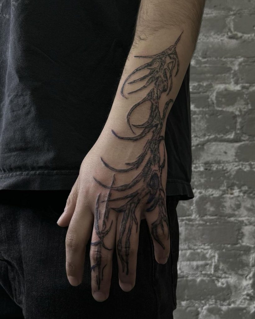 This striking tattoo flows down the forearm and over the hand, resembling skeletal, organic structures with cybernetic influences. The dark, jagged lines and intricate detailing give it a futuristic yet primal vibe. Wrapping naturally around the hand, it feels like a fusion of technology and nature.