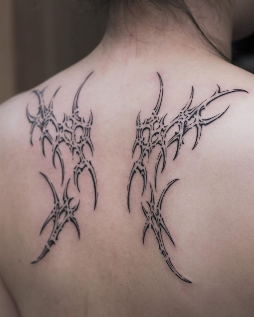 This bold upper back tattoo features two symmetrical cybersigilism-inspired designs, with sharp, intricate patterns that radiate an edgy, futuristic aesthetic. The placement mirrors the natural curvature of the shoulders, giving the tattoo a balanced and striking appearance. It’s a modern, minimalistic statement piece with a touch of mystique.