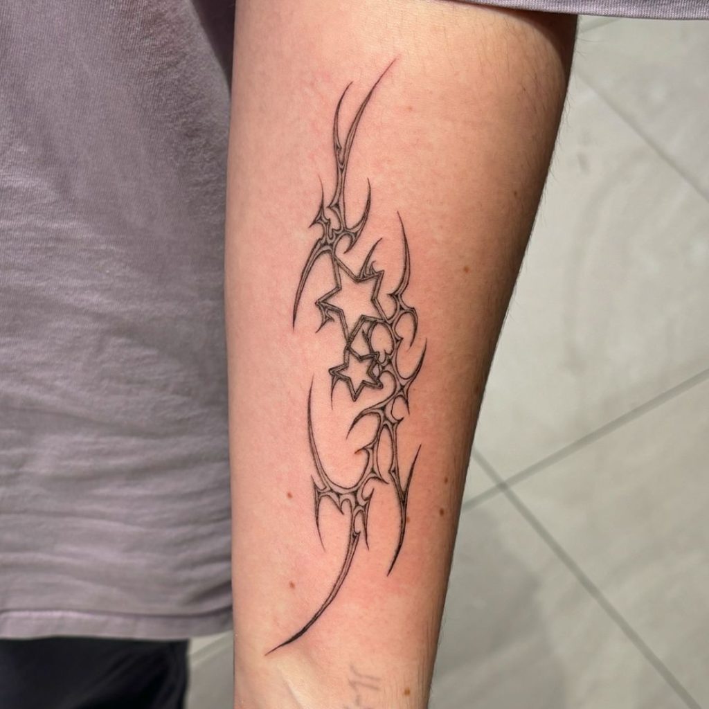 This intricate tattoo features sharp, flowing lines intertwined with bold, outlined stars, creating a mix of celestial and edgy vibes. Placed on the forearm, the design balances elegance with a futuristic feel, making it stand out while staying minimal. The stars add a touch of whimsy to the sleek, abstract composition.