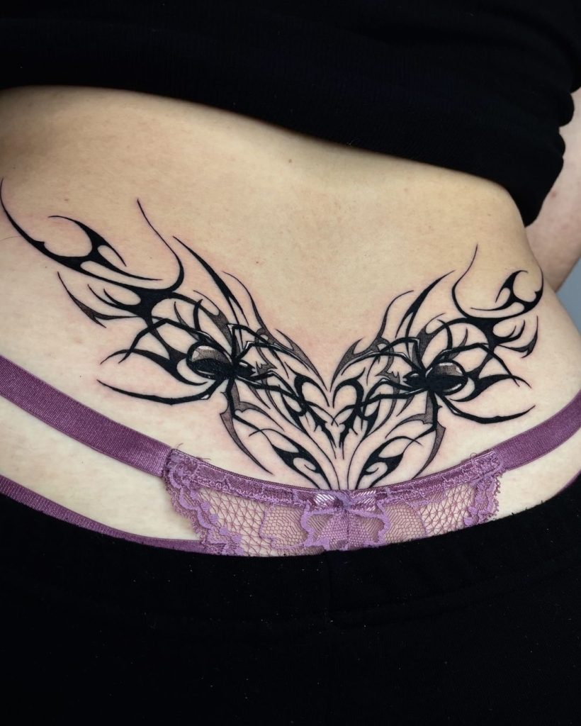 This captivating lower back tattoo features a delicate cluster of abstract butterfly shapes with sharp, spiked accents that form a symmetrical, flowing design. The intricate linework adds depth and elegance, while the edgy details bring a modern twist. The placement emphasizes the natural curve of the lower back, creating a striking and graceful statement.