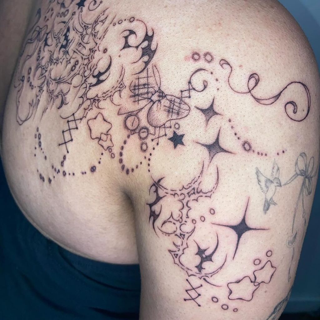 This playful tattoo features a mix of swirling clouds, sparkling stars, and delicate dotted patterns that wrap gracefully over the shoulder. Intertwined with abstract shapes and dainty details, the design feels light and dreamy. Its whimsical placement and celestial theme make it a fun and enchanting addition.