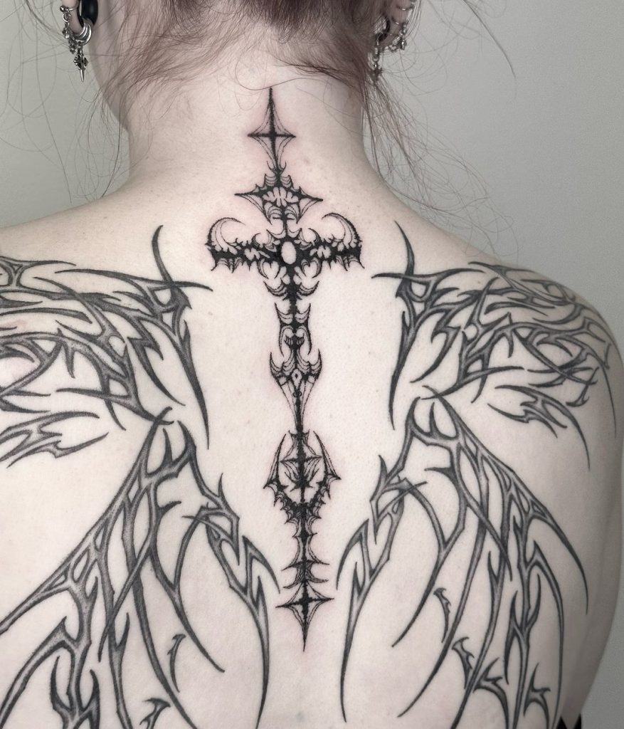 This intricate tattoo showcases a beautifully detailed cross design running vertically down the upper spine, framed by bold wing-like patterns extending across the shoulder blades. The cross features sharp, symmetrical details and delicate ornamentation, giving it a celestial and gothic feel. The placement harmonizes the designs, creating a powerful and elegant statement piece.