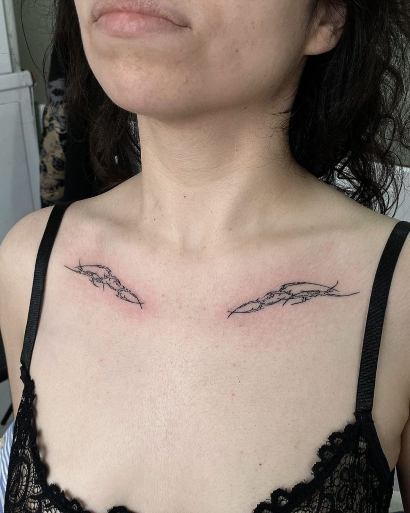 These minimal yet intricate designs rest gracefully along each collarbone, resembling sharp, flowing sigils with a subtle cybernetic edge. Their fine lines and symmetrical placement create a refined, modern look, emphasizing elegance with a futuristic twist.