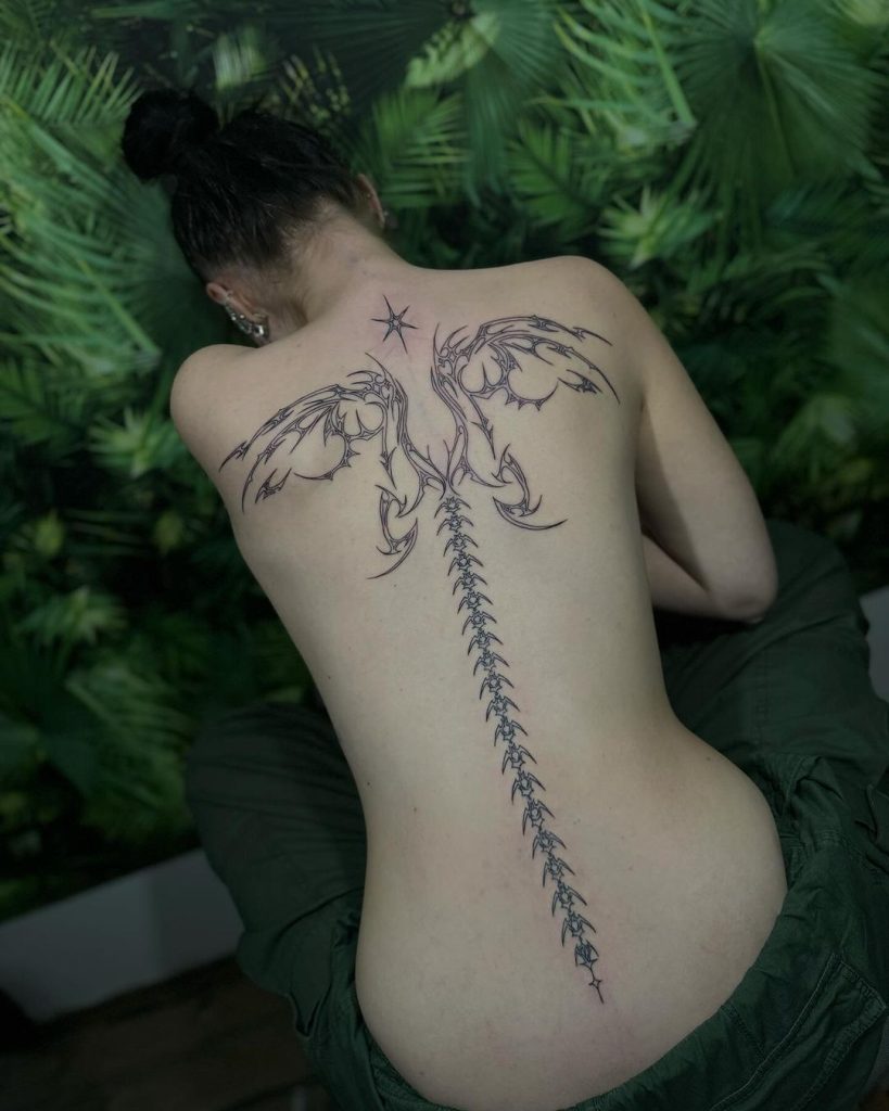 This stunning tattoo features a delicate spine design running down the center of the back, with intricate wing-like patterns branching out at the upper back. At the top, a small star adds a celestial touch, creating a blend of anatomical elegance and fantasy. The placement emphasizes the natural curve of the back, making it both graceful and striking.