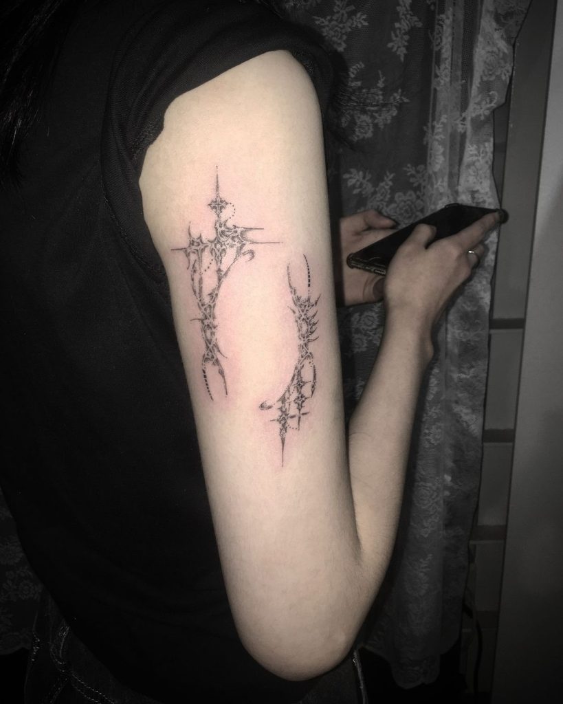 This intricate tattoo wraps around the upper arm, featuring fine, symmetrical linework and sharp, abstract shapes inspired by cybersigilism. The design includes cross-like elements and flowing patterns, creating a mystical and futuristic aesthetic. Its placement enhances the arm s natural structure, making it a subtle yet captivating piece.