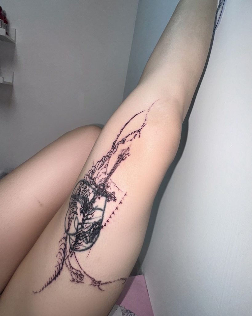 This unique thigh tattoo showcases an abstract cybersigilism design with delicate, flowing lines and intricate details. The composition combines sharp geometric elements with organic shapes, creating a futuristic and mystical feel. The placement on the thigh emphasizes its artistic and dynamic nature, making it a striking piece of modern tattoo art.