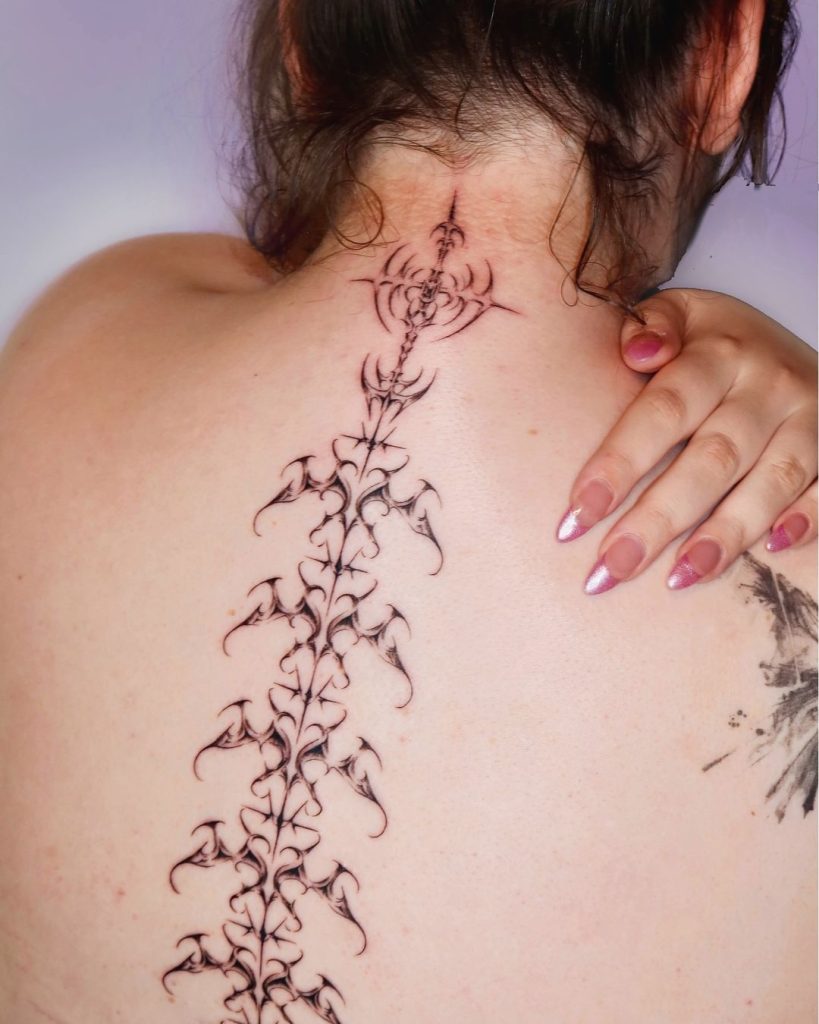 This stunning spine tattoo features a delicate, flowing design resembling a vine with pointed, organic shapes climbing down the back. The intricate linework creates a graceful, symmetrical pattern that follows the natural curve of the spine. Its placement highlights the back’s elegance, making it both bold and ethereal.
