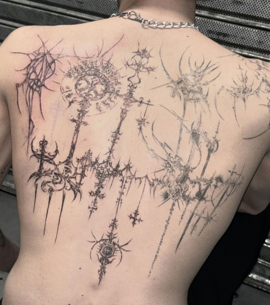 13. Chaotic Cybersigilism Back Tattoo with Spiked Designs